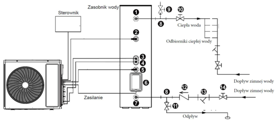 Rysunek 1 - Połączenie jednostki zewnętrznej multi split Water Heating z zasobnikiem
