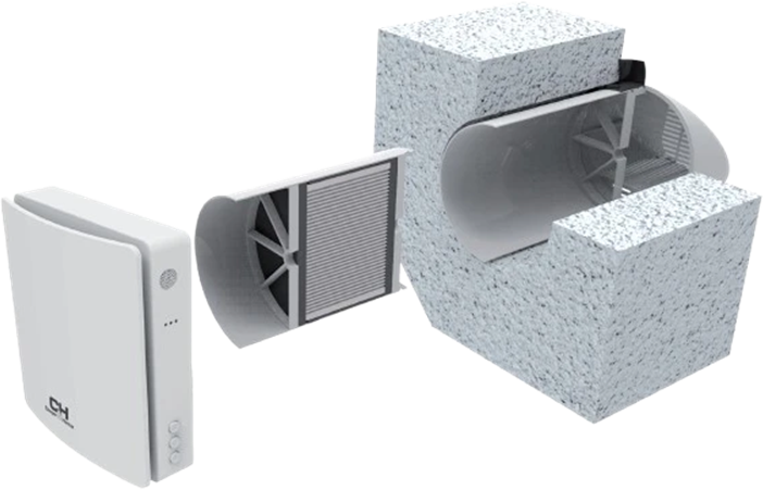 CH-HRV070K to urządzenie proste w budowie, dedykowane do realizacji wymiany powietrza w pomieszczeniach. Rekuperator montowany jest w otworze w ścianie zewnętrznej. Jego zadaniem jest cykliczne nawiewanie oraz wywiewanie powietrza z pomieszczenia. Standardowo cykl trwa 75 sekund. Przepływ odbywa się przez akumulacyjny wymiennik ciepła, co pozwala na odzysk ciepła oraz wilgoci. Jego efektywność sięgać może nawet 97%. Od wewnętrznej strony urządzenie buduje panel frontowy, z kolei po stronie zewnętrznej zakończony jest modułem czerpnio-wyrzutni powietrza.