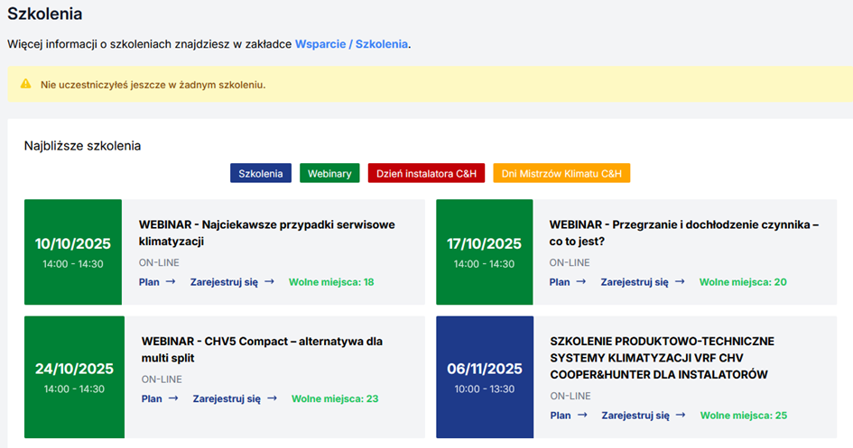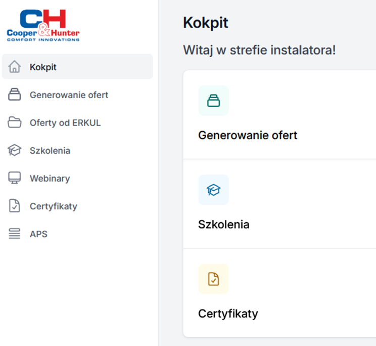 Strefa Instalatora to obszar przygotowany specjalnie dla techników HVAC C&H. Narzędzie jest całkowicie bezpłatne i wymaga jedynie zarejestrowania konta. Po zalogowaniu użytkownik otrzymuje dostęp do generatora ofert, pełnej bazy dokumentacji urządzeń, zapisów na szkolenia, nagrań webinarów oraz panelu swoich certyfikatów. Dzięki temu praca z Cooper&Hunter jest jeszcze łatwiejsza!